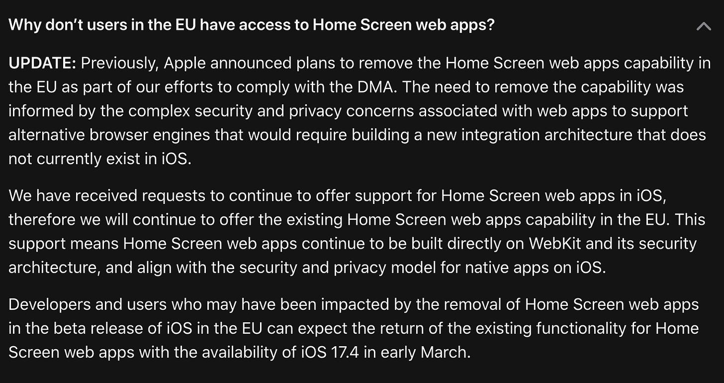 Developers and users who may have been impacted by the removal of Home Screen web apps in the beta release of iOS in the EU can expect the return of the existing functionality for Home Screen web apps with the availability of iOS 17.4 in early March.