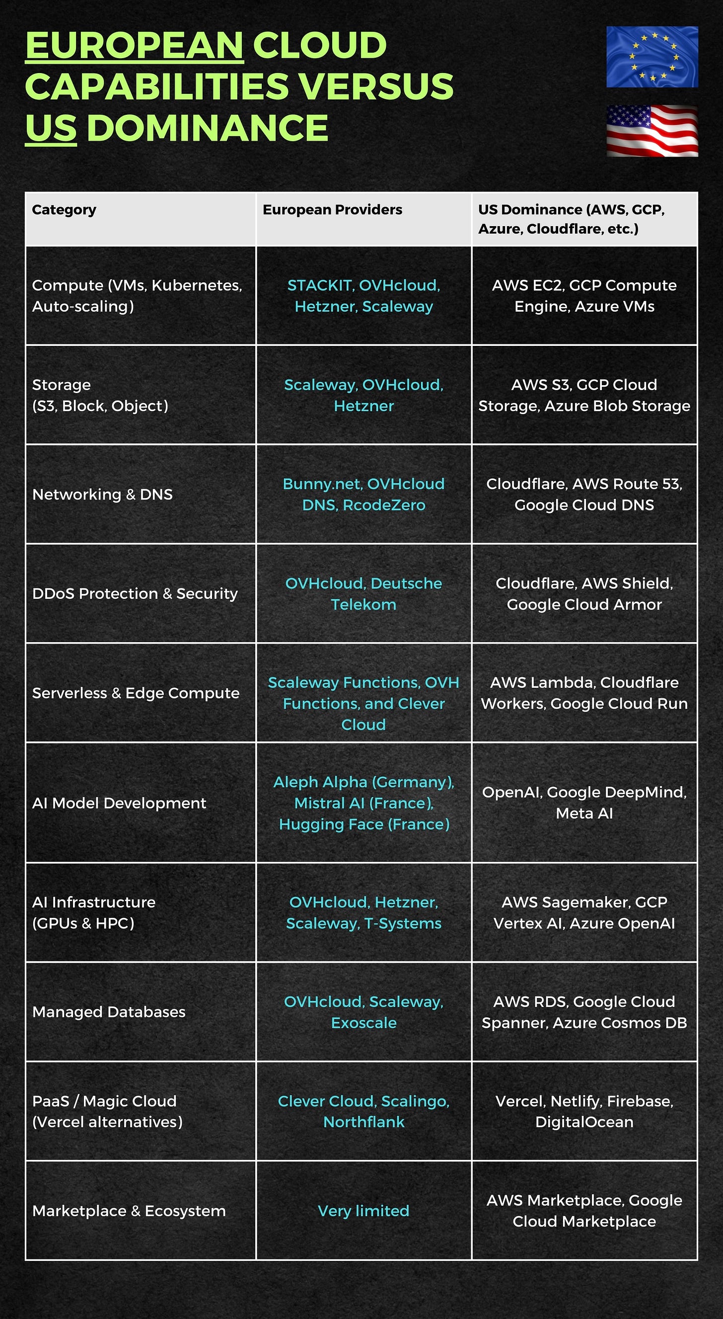 European businesses can already operate independently of US cloud providers for standard workloads. However, the problem arises when companies need highly specialized services such as AI infrastructure (AWS Sagemaker, GCP Vertex AI), serverless functions (AWS Lambda, Cloudflare Workers), and managed data warehouses (BigQuery, Snowflake).