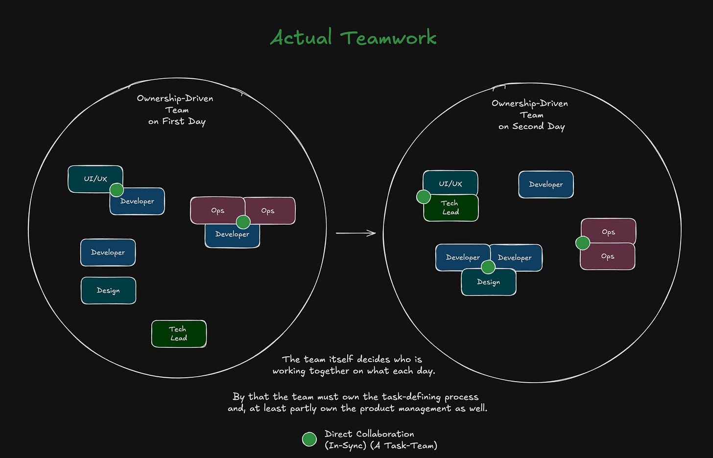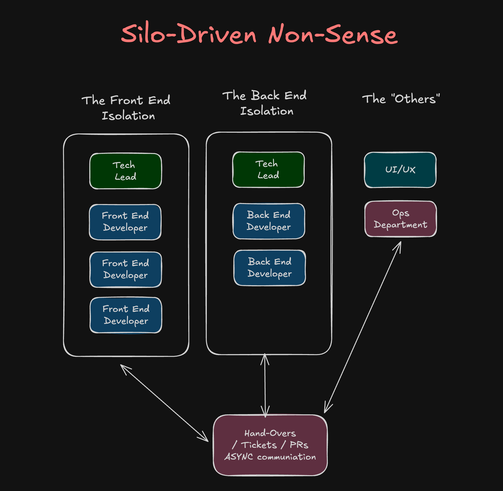 On the left, a circle that represents the “team on paper”. Inside, you see UI/UX, a couple of developers, ops, maybe a tech lead. It looks like a team, but if you zoom in on a regular Tuesday, everyone is working alone. Their work only touches on tickets, handovers, and status updates.