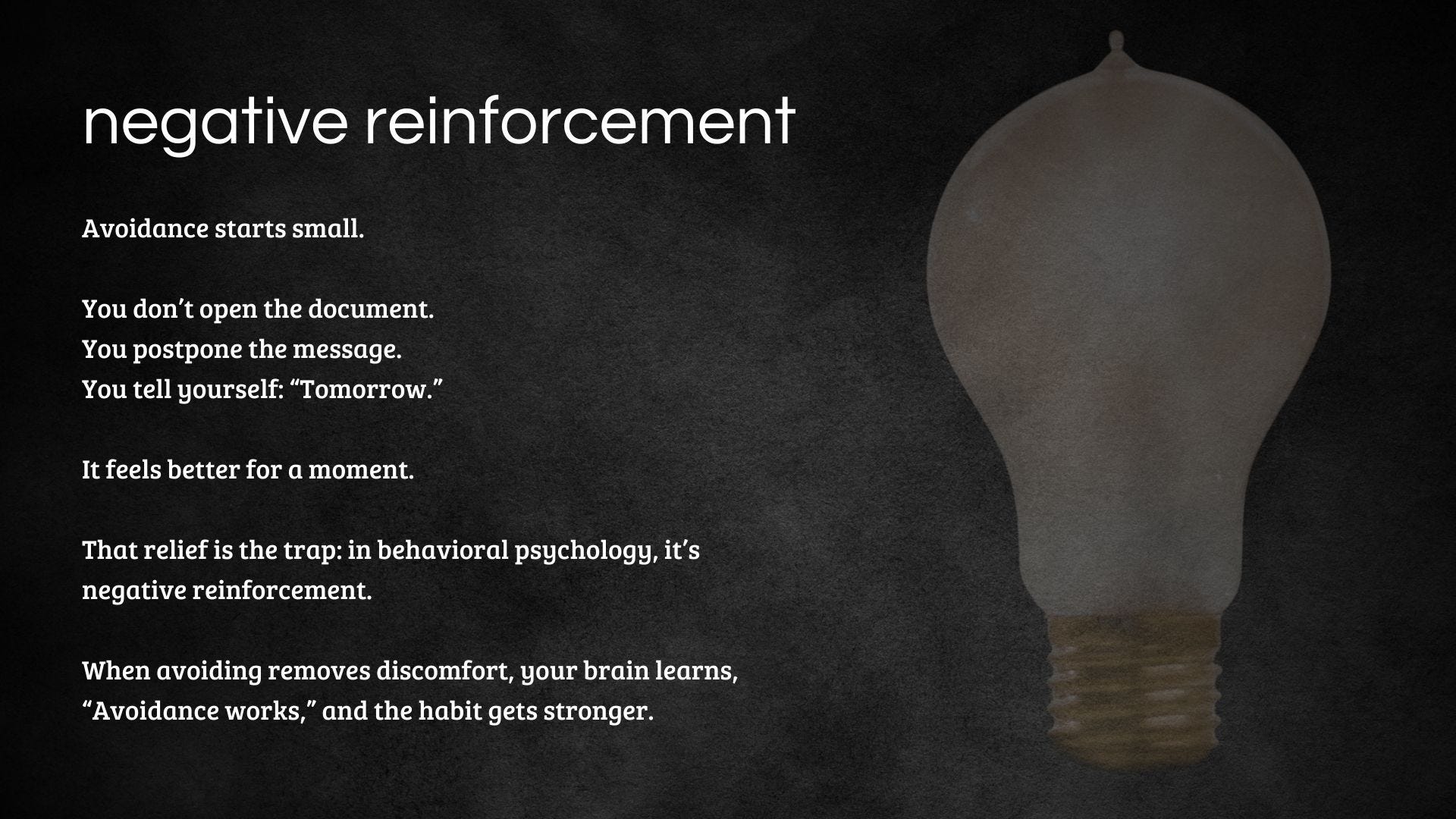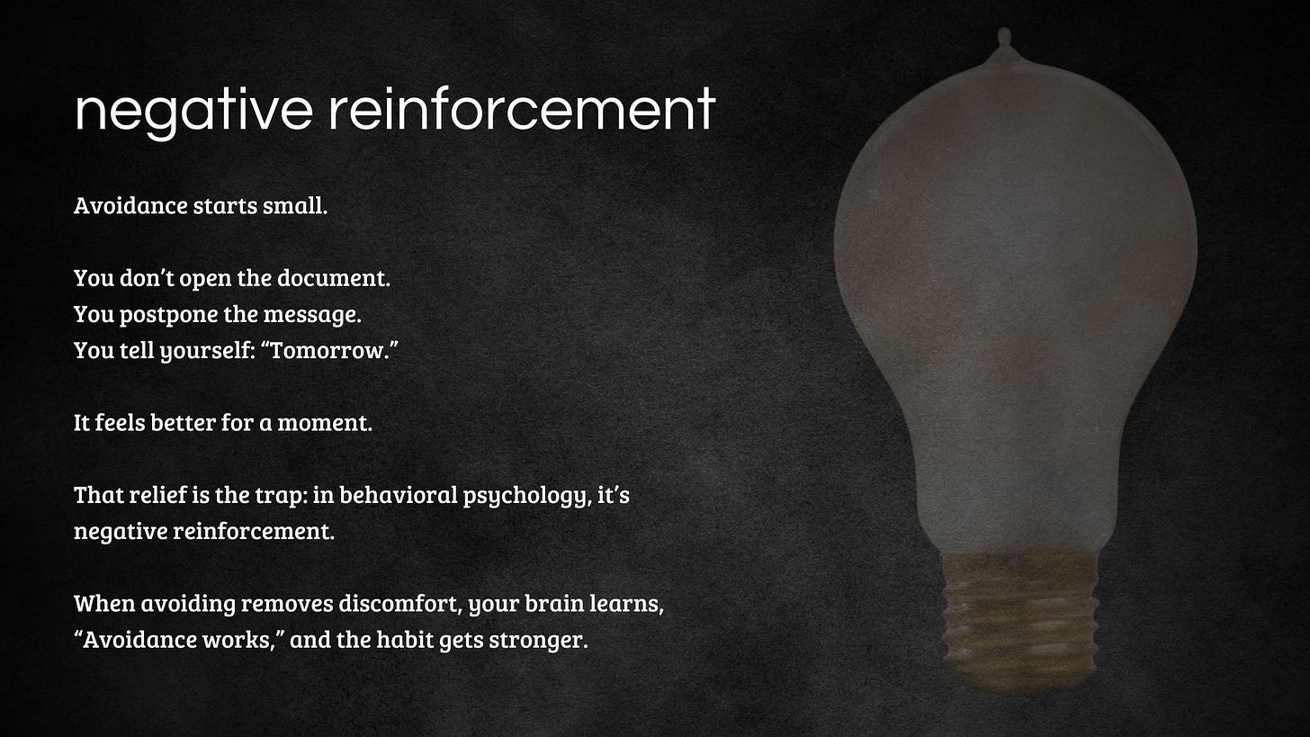 This is where avoidance begins. You delay opening the document. You tell yourself you will prepare for the conversation tomorrow. You distract yourself with something easier. Avoidance offers short-term relief. Behavioral psychology calls this negative reinforcement: removing discomfort strengthens the avoidance behavior.