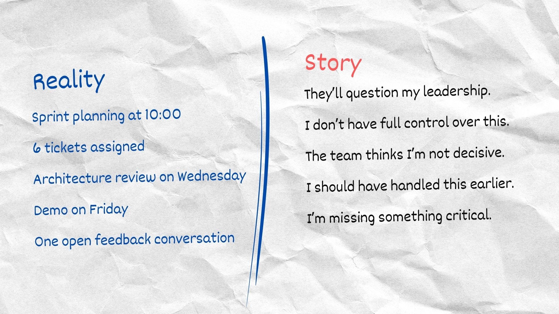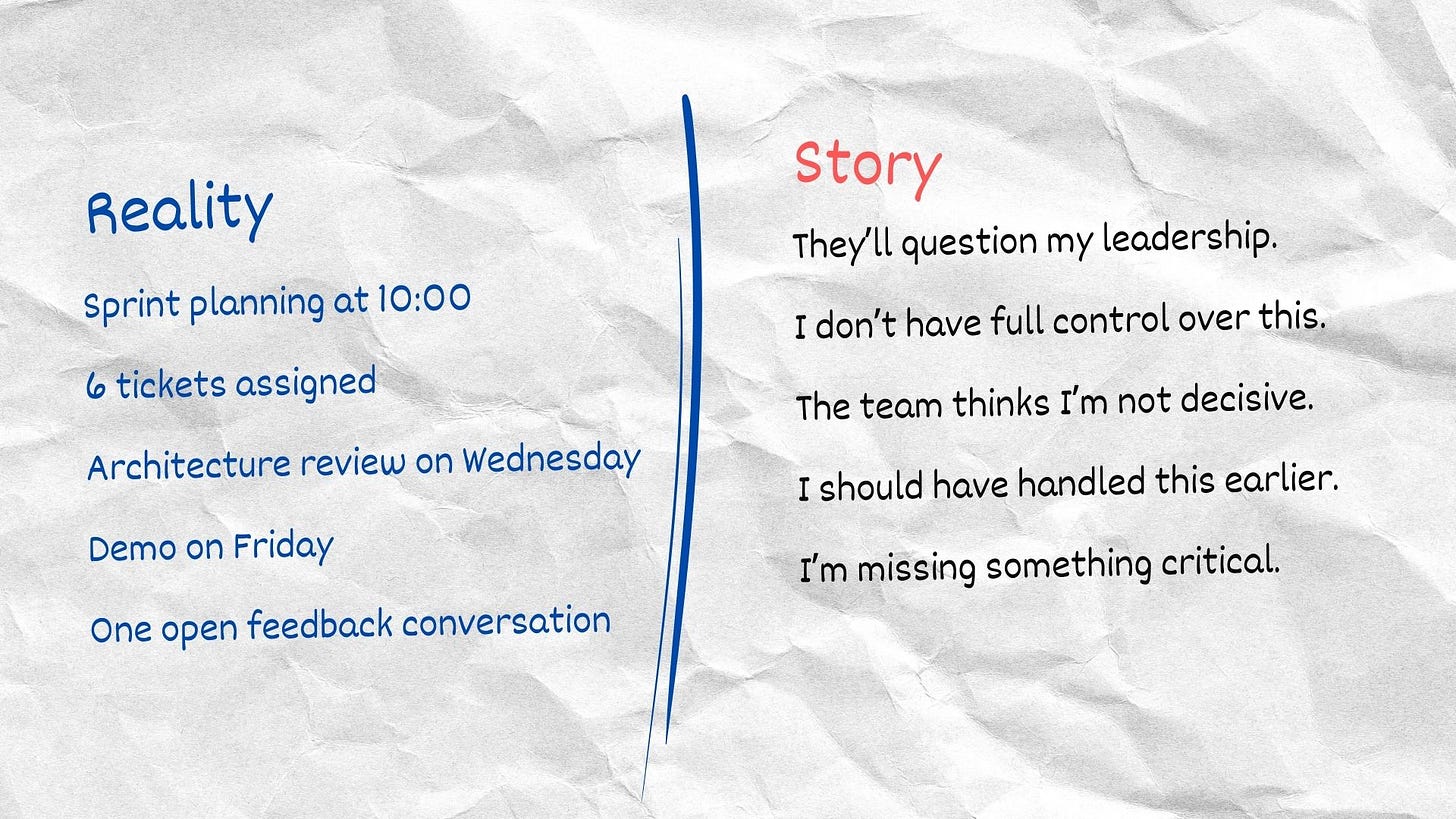 Reality is concrete. It can be written down. It has boundaries. It consists of tasks, meetings, constraints, and deadlines. The story is interpretive. It consists of imagined failure, assumed judgment, and predicted conflict.