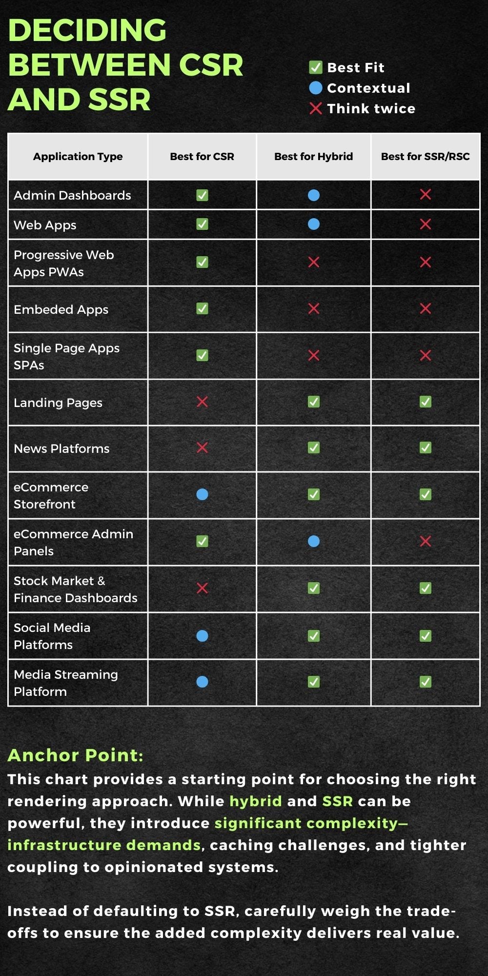 An Anchor Point is a starting reference that helps guide decision-making without dictating a rigid rule. In the context of rendering strategies, it provides a default perspective—not an absolute mandate. This means CSR should generally be preferred unless specific needs justify hybrid or SSR approaches. The goal is to avoid unnecessary complexity and opinionated constraints by evaluating trade-offs carefully. Instead of blindly adopting SSR/RSC just because it’s trendy, use this anchor point to think critically about what actually fits your use case.