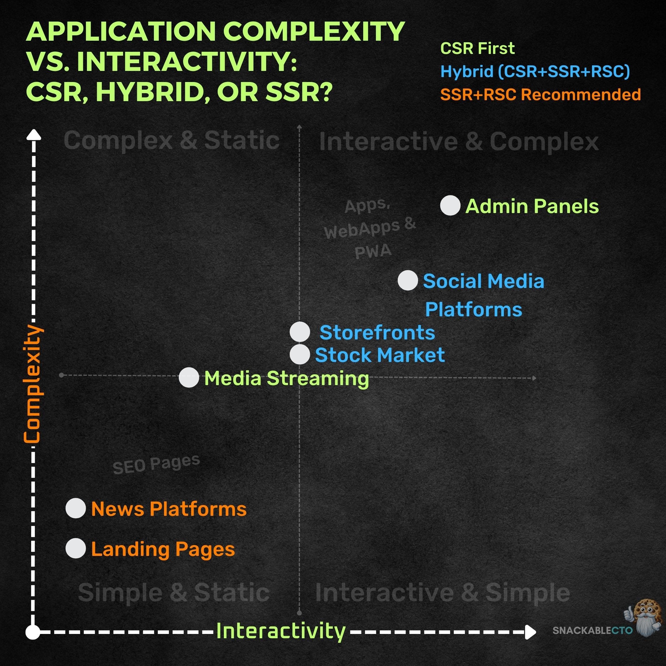 This quadrant chart visualizes the trade-offs between application interactivity and complexity, helping guide decisions on rendering strategies. Applications in the bottom-left (e.g., landing pages, news platforms) benefit most from SSR+RSC for SEO and quick loads. Highly interactive but simple apps (e.g., media streaming) thrive with CSR due to reduced server reliance. The top-right quadrant, representing complex and interactive apps like admin panels and social media platforms, often requires a hybrid approach (CSR+SSR+RSC) to balance performance and maintainability. This framework provides a strategic starting point to assess when CSR, SSR, or a mix makes sense rather than defaulting to SSR-heavy architectures.