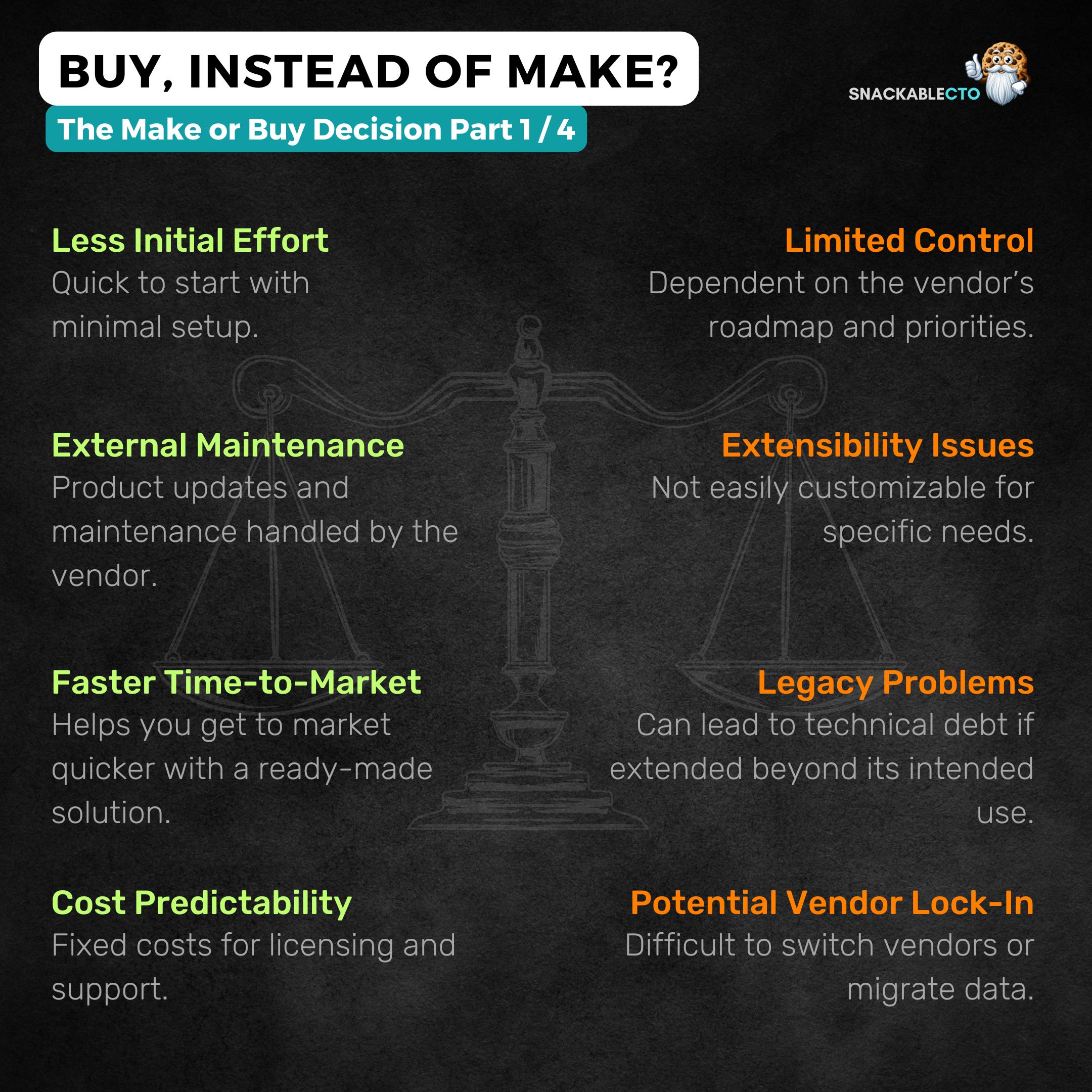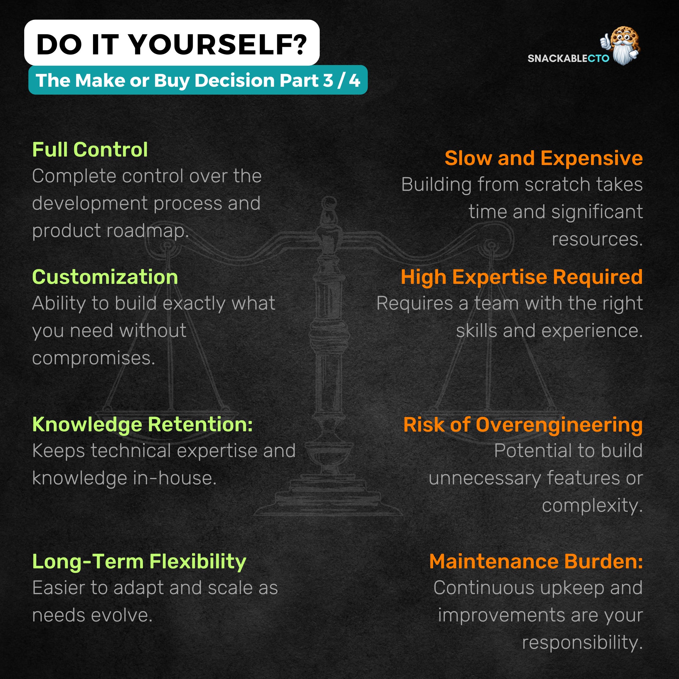 As a CTO in a small to medium-sized business (SMB), I've spent the last 15 years making tough decisions about whether to build software in-house or buy existing solutions. This "make or buy?" dilemma is something every tech leader faces at some point, and it's never a one-size-fits-all answer, and it hurts me a lot.