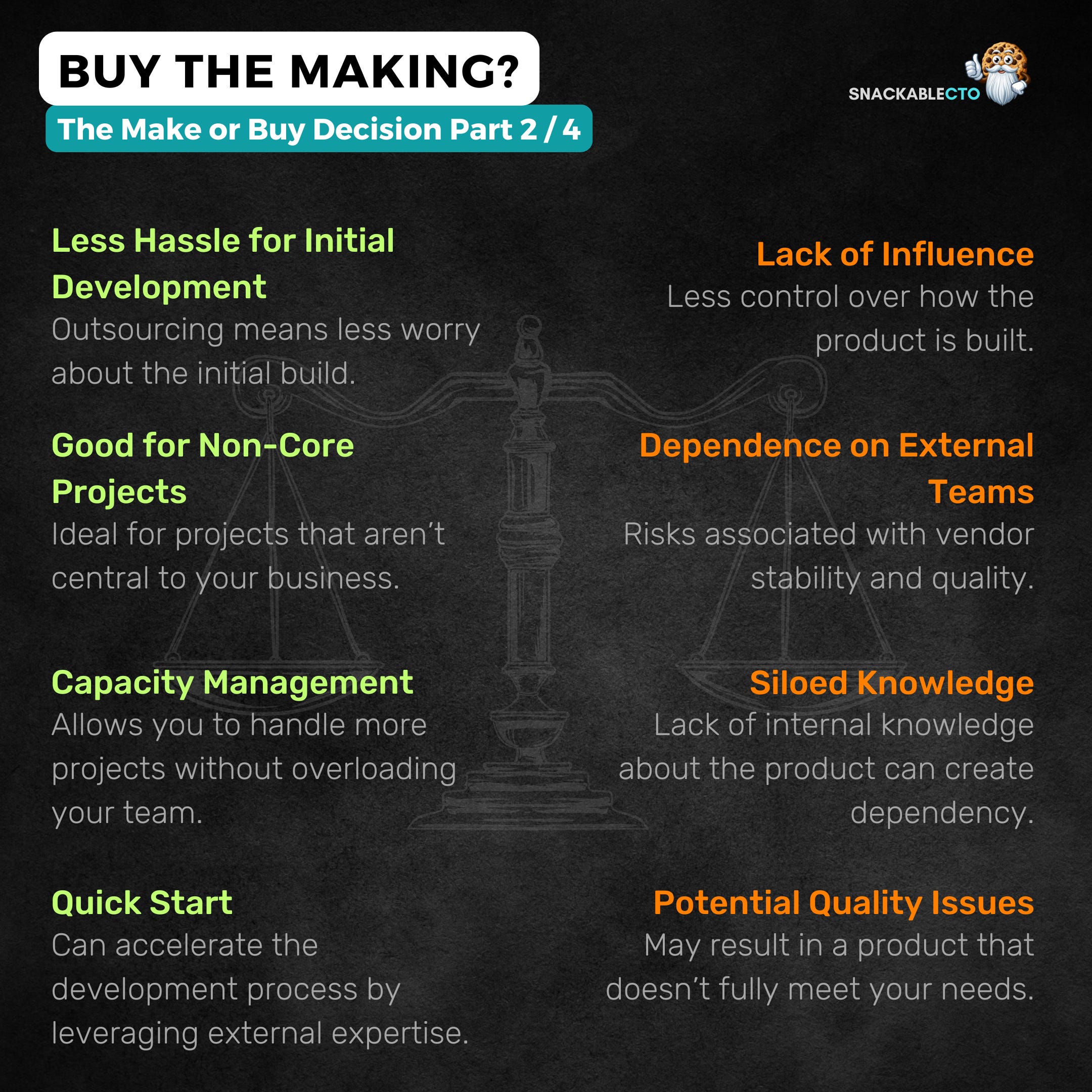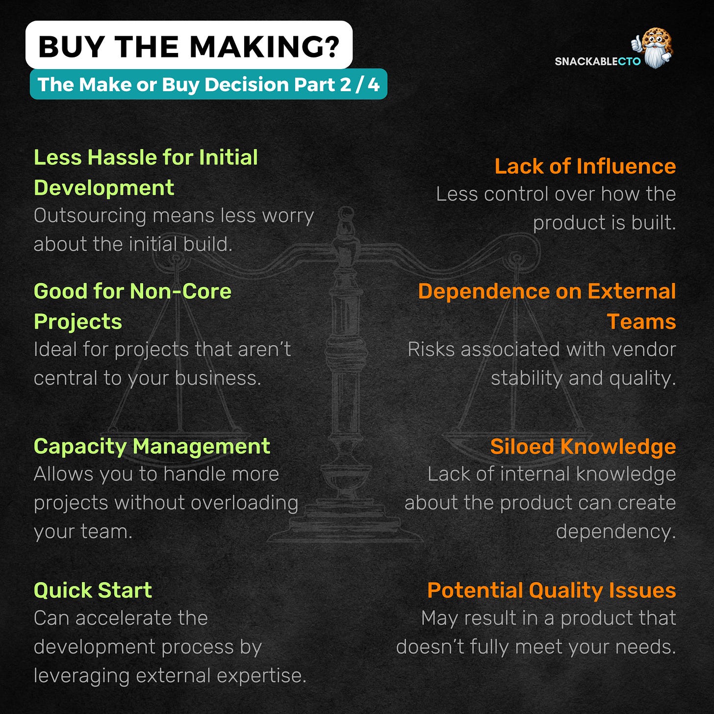 Okay, with some risk? Buying or outsourcing might be excellent if you’re willing to take on a bit of risk, like relying on a vendor or third-party developers.