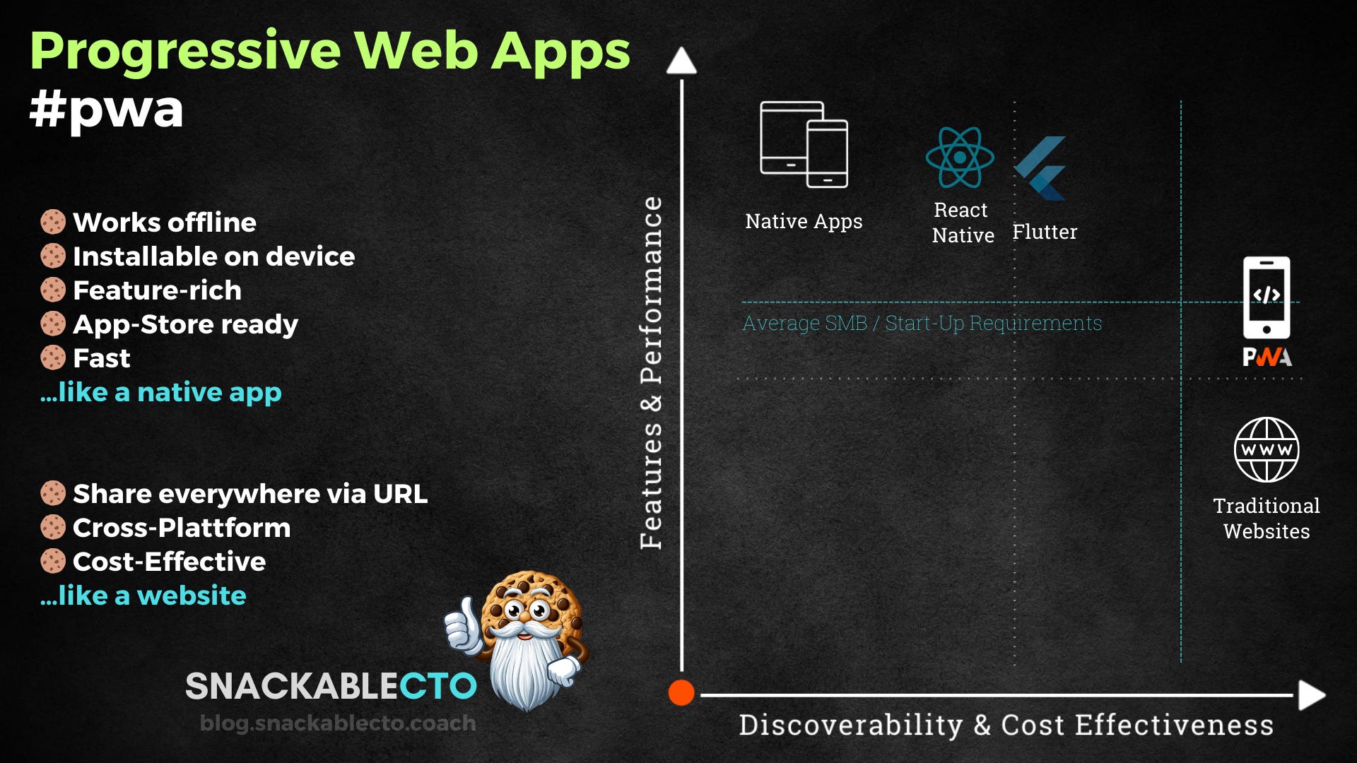 In summary, if your app heavily relies on mobile performance, OS-level integrations, or intensive UI/UX requirements, Flutter or React Native might be the better option. However, if discoverability, cost-efficiency, and fast deployment are priorities, PWAs remain the most substantial choice for most SMBs and startups.
